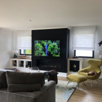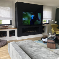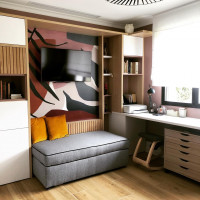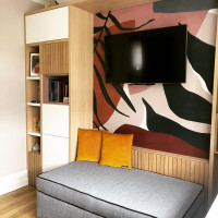 Dans ce projet, nous sommes intervenus dans plusieurs espace de la maison, la pièce de vie et le bureau qui fait office de chambre d’amis.Les clients souhaitaient installer un poêle dans leur salon, l’idée était de combiner le meuble T.V avec le nouveau poêle. Nous avons réalisé sur mesure un coffrage avec des niches et installé un revêtement en relief sur le panneau principal pour créer du volume.Le bureau a été une création totale, avec pour objectif avoir du rangement, un bureau et la mise en place d’une banquette lit, là encore une bibliothèque sur mesure dessiné par nos soins a été réalisé répondant à tous les critères.LESIGNY Juin 2021